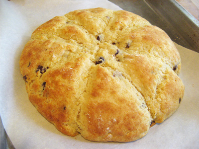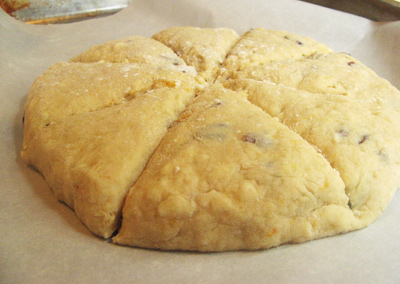 Take a pastry cutter or large knife and cut into wedges. Place in a 400 degree oven for 15 – 20 minutes. If you leave the scones intact, they will have softer edges.