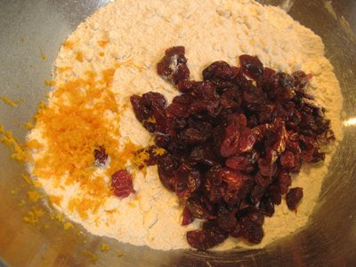 Mix together flour, sugar, baking powder, and salt. Cut in butter with a pastry blender until mixture becomes a coarse crumbly mix. Stir in dried cranberries and orange zest.
