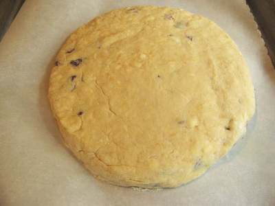 Flour a working surface and work dough into a round shape. The thickness should be at least an inch thick. Place on a cookie sheet lined with parchment paper.