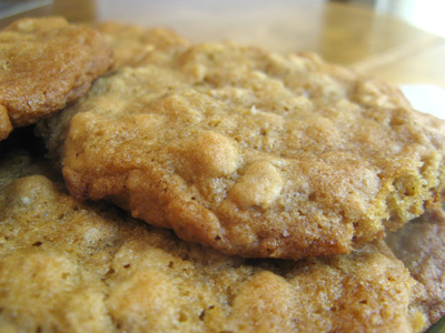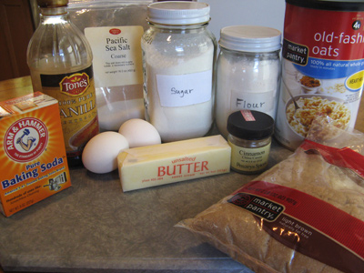 You’ll need some flour, white and brown sugar, baking soda, salt, butter, eggs, vanilla, oats and cinnamon, not in that order.