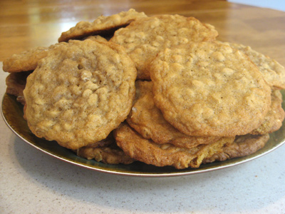 I have 2 old cake pans that work great for cookies, better than any cookie sheet I own. I use an ice cream scoop to place nice round dollops onto my pans. This will make approximately 24 large cookies. If you want to make your dough go farther, use a rounded tablespoon to make a smaller cookie. Place in a 350 degree oven for 9 – 11 minutes. If you like a soft chewy cookie take out when the outer edges just begin to brown and the center is beginning to set. Set the cookies on top of the warm stove allowing the cookies to continue to cook while on the hot pan until you remove them to the cooling rack.
