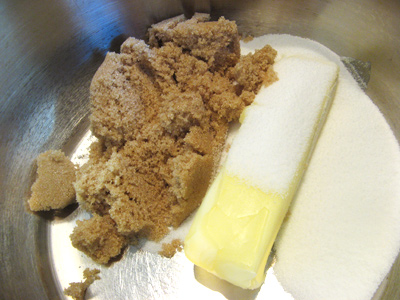 In a mixing bowl, add 1 stick of butter, 1/2 cup of sugar, and 1/2 cup of brown sugar.