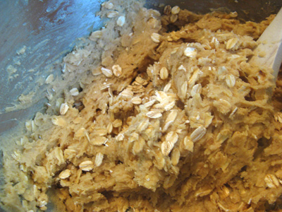 Once the mix is creamy, add in the oats. Fold these in with a wooden spoon. I’m not a fan of raisins, but if you are this would be the time to add them.