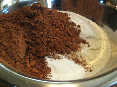 In another bowl stir together the dry ingredients of flour, cocoa powder, baking soda and a pinch of salt. While the mixer is on low, add the dry ingredients until they are all incorporated.