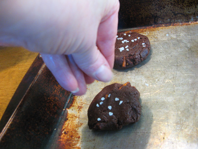 Lightly sprinkle a bit of sea salt over each cookie. Bake in a 350 degree oven for 9 – 10 minutes.