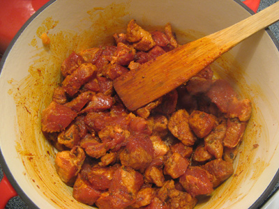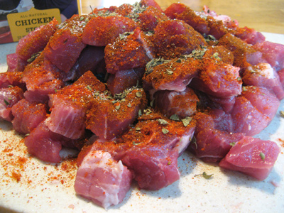 To get started, cut and trim a 2 1/2 pound pork roast into 1/2 inch cubes.  I seasoned the meat with smoked spanish paprika, mexican oregano, ground ancho chile and salt. A box of chicken stock will come later.