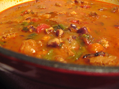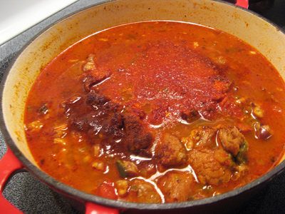 At this point I took a taste to see if it needed more spice.  I added a tablespoon more chili powder because we like it spicy. I put it back on the stove to simmer.  You can serve the stew at any time, but I like to let it simmer for at least a couple hours.  The pork will fall apart tender and the stew will be more flavorful.  Before I had a dutch oven, I would simmer this all day in the slow cooker.