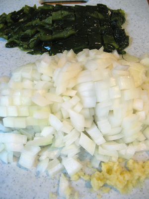 Dice one whole onion and mince 2 cloves of garlic on a microplane hand grater.  I roasted 2 poblano chiles in the oven, then peeled, seeded and chopped them.  If you are in a hurry, chop the poblano’s and cook them along with the onions.   I roasted them as a preference.