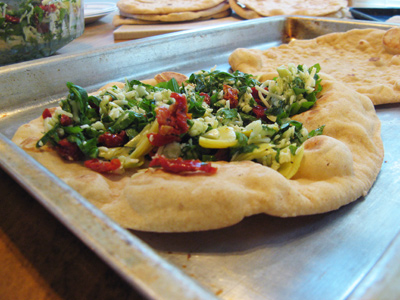 I made a batch of flatbreads, 8 in all but we are only making 3 pizza’s now. I put a layer of the mix directly on the flatbread. Both the flatbreads and spinach artichoke mixture will keep in the refrigerator so you can make a pizza in minutes.