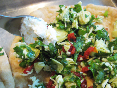 Now it’s time to put your toppings on. If you like the spinach artichoke dip idea, place little dollops of cream cheese on top. They will melt right along with the cheese and have a creamy taste.