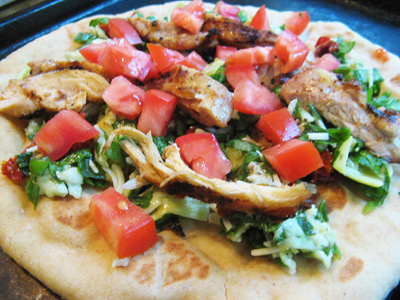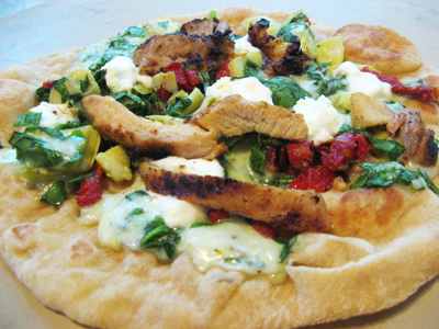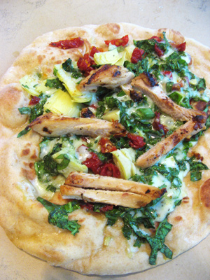 The cheese has melted and the crust is ready. This one had grilled chicken.
