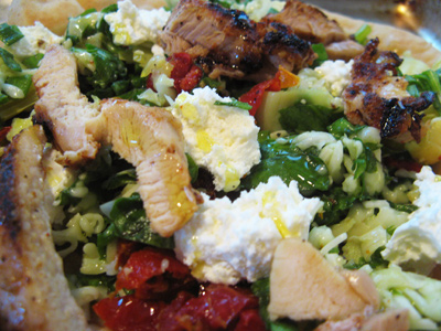 Your choice of toppings such as grilled chicken, fresh diced tomatoes, roasted tomatoes, cream cheese, mushrooms, red onion, red pepper.