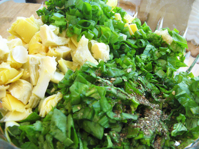 Add the artichokes, green onion and italian herb blend to the bowl of spinach.