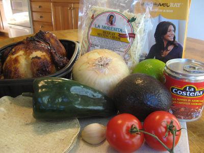 Bear with me because I started laying out things that I wanted to include in the soup and then changed it up. I did use these items though. I was on the fly tasting and adjusting the amounts but it all came together in the end. I started with a rotisserie chicken. I picked it apart and shredded it. Only used the dark meat (about 2 cups) and saved the rest for another meal. I diced half an onion, 1 whole poblano chile, 1 tablespoon Chipotle en adobo sauce, a clove of garlic, Mexican melting cheese and broth. Tomatoes, tortillas, lime, and avocado topped it off.