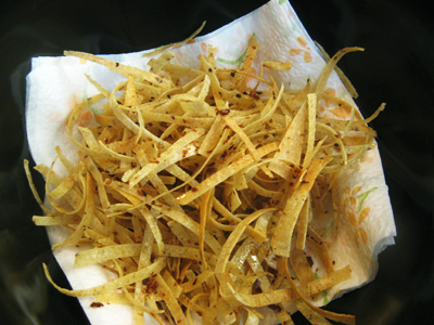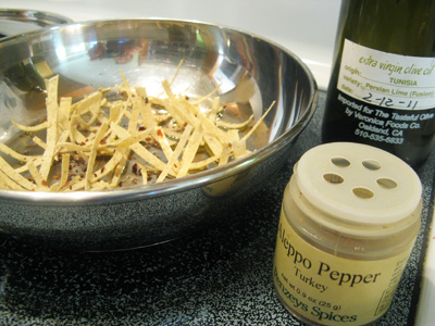 To make tortilla strips, drizzle olive oil in a heated pan and add a handful of tortilla strips. Sprinkle with Aleppo pepper flakes and continue frying until the strips start to curl. Using tongs turn them over until they have cooked on all sides. They will become crisp in just a minute or two. Transfer to a bowl lined with a paper towel to dry. Make these in batches. Using some paper towels wipe the pan clean of pepper flakes before starting again. The pan will be hot so use caution.