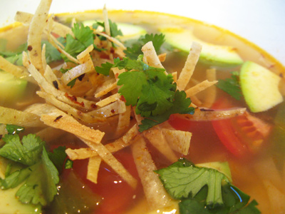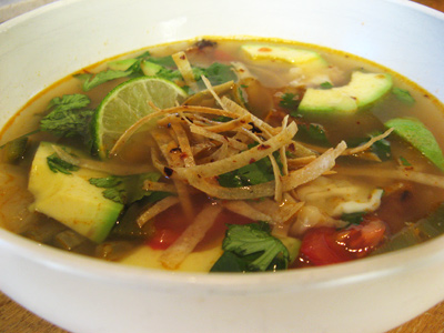 To assemble soup, layer desired amount of shredded chicken and grated Mexican cheese in bowls. Ladle soup and add a few avocado slices and chopped tomato. Top with crisp tortilla strips and cilantro. If desired, squeeze the juice of a lime wedge and add to the soup.