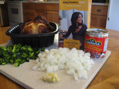 Pull meat from rotisserie chicken and shred enough of the chicken to make 2 cups. The rest can be used for another meal. In a medium sized pot drizzle olive oil and add diced onion and poblano. Saute over medium heat until softened and onions become translucent. Add 1 tablespoon pureed Chipotle en Adobo and minced garlic to the pan. Stir and continue cooking for another minute until fragrant. Add the 6 cups of chicken stock, bring to a boil, then lower heat and simmer for 10 minutes.