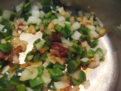 Drizzle some olive oil in a medium stock pot. Add your onion and poblano and cook over medium heat for a few minutes until they soften and onions become translucent.