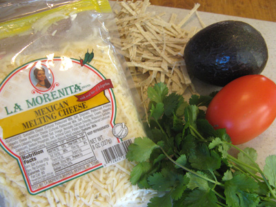 I took some kitchen scissors and cut 8 tortillas into tiny strips. I chopped the tomato, sliced the avocado and roughly chopped the cilantro to top the soup. And this Mexican melting cheese was originally going on top but I changed my mind and it went on the bottom of the soup bowl along with the chicken.