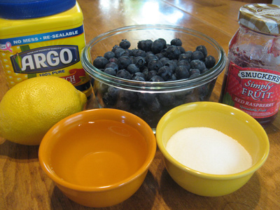 The blueberry sauce consists of 1 pint or 2 cups fresh blueberries, sugar, water, lemon zest, lemon juice, cornstarch, and some red raspberry preserves.