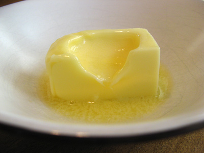 To make the ancho honey butter, take 1/4 cup or 1/2 stick of butter and melt in microwave on high for 20 second intervals (probably 40 seconds altogether) until your butter starts to melt in the center.