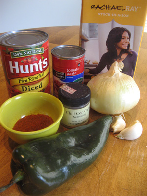 I assembled together my ground chile powder plus Penzey’s Chili Con Carne, a mild spice blend of chili peppers, cumin, garlic, oregano, coriander, onion, red and green bell peppers, allspice, cilantro and cloves. Also an onion, some garlic, fire roasted tomatoes, tomato paste, chicken stock and a poblano chile.