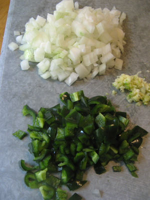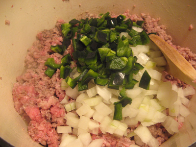 I started to brown a pound of ground beef and a pound of ground pork. Once it begins to brown throw in the onions, garlic and poblano pepper.