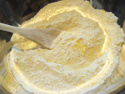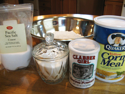 While the chili is simmering on the stove, I’m getting the dry ingredients together for the sweet cornbread. You’ll need some flour, cornmeal, salt, sugar and baking powder.
