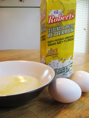 The wet ingredients include melted butter, buttermilk and eggs.