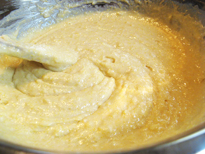 Mix together 1 1/2 cups flour, 2/3 cups sugar, 1/2 cup cornmeal, 1 tablespoon baking powder and 1/2 teaspoons salt together in a large mixing bowl.