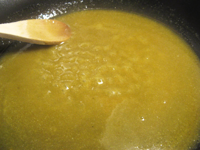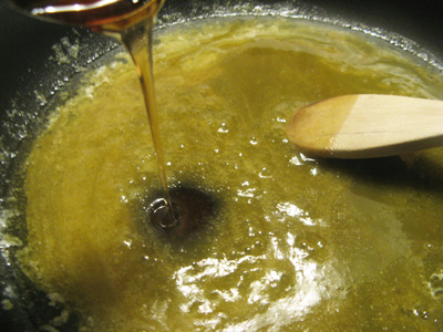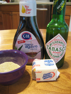 I melted the butter, added 1 teaspoon of the seasoning mix and 2/3 cup of the Tabasco green. Now I’m adding 2 tablespoons of the agave nectar. The Tabasco sauce is mild but a little vinegary, the seasoning gives it a kick of heat and the agave gives it just enough sweetness to balance everything.