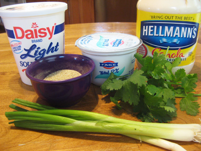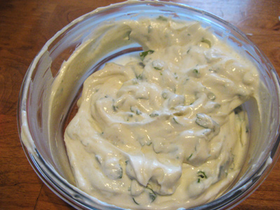 I made the cilantro dipping sauce ahead of time so that the flavors could have time to blend. Blend together greek yogurt, sour cream, mayo, cilantro, green onion and seasoning mix.