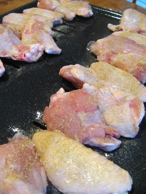 Place aluminum foil on the bottom pan of a broiler pan and coat with cooking spray. Layer your wings over the top pan and generously sprinkle the seasoning mix over the wings. Turn them over and season the other side. Drizzle with olive oil and place in a 425 degree oven for 40 minutes, turning them over after 20 minutes so that they brown on both sides.