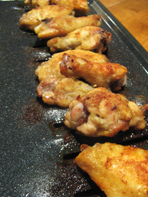 The wings are out of the oven, crisp and brown, ready to go into the sauce.