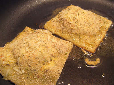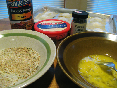 I had 18 ravioli left. I poured about a cup of bread crumbs into a bowl and added some Italian seasoning and grated parmesan cheese blend. I accidentally dumped the Tuscan Sunset so it was seasoned real good. Probably a couple teaspoons would be about right. And a beaten egg to dip the ravioli and hold all those crumbs in place.
