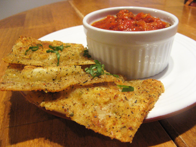Heat a non-stick skillet over medium heat. Drizzle olive oil to coat bottom of pan and place a few ravioli in the pan at a time. Pan fry for a minute or two until the bottom edges start to turn brown. Gently turn over to toast the other side another minute more. Remove to a warming plate while you fry the remaining ravioli.