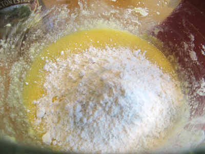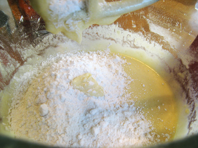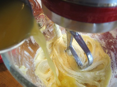 Sift together your cake flour, baking powder and salt. Add about half the flour mix to the bowl and blend well, scraping the sides of the bowl.