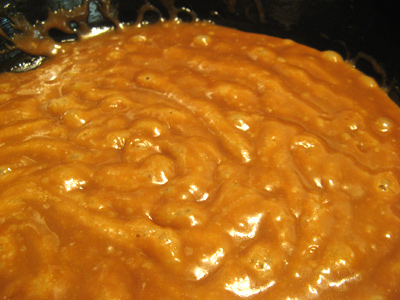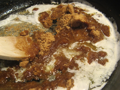When the butter has melted, add the dark brown sugar and stir to make a caramel sauce.