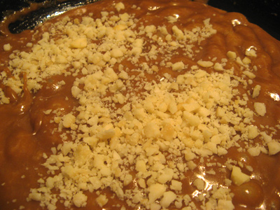 The last 30 seconds add the chopped macadamia nuts to the caramel sauce. Once your 4 minutes is up take the skillet off the hot burner.