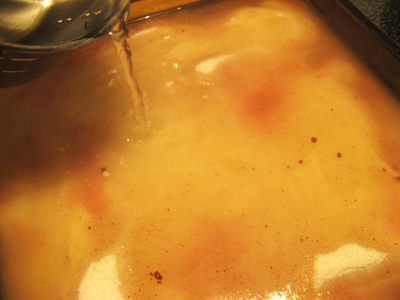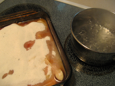 Pour slowly so as not to displace the sugars on top. Now place the baking dish in a 350 degree oven for 1 hour.