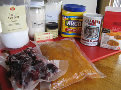 For the fruit, I thawed 2 cups of frozen peaches and 1 1/2 cups frozen blackberries. The topping consists of butter, flour, sugar, salt, corn starch, baking powder, and half and half.