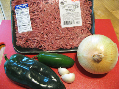 To get started you’ll need 1 1/2 pounds of ground beef, 1 poblano chile 1 jalapeno, 2 cloves garlic and 1/2 sweet onion.