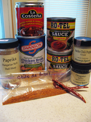 The sauce is composed of RoTel original tomato sauce, chicken broth, chipotle puree, paprika, ground ancho chili, Mexican oregano, chile de arbol and worcestershire which I forgot to include in this picture.