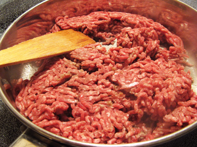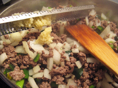 Brown ground beef in a large skillet over medium high heat.  Add diced onion, poblano and jalapeno and continue cooking until vegetables soften and become translucent.  Add grated garlic and stir for a minute more.
