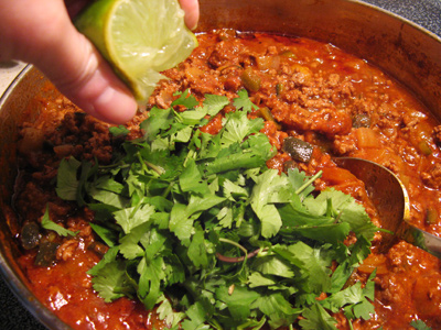Once the meat has simmered for 15 minutes or so the juices will have cooked down and it’s time to add in the cilantro and lime juice. Stir for a minute or so and salt to taste.