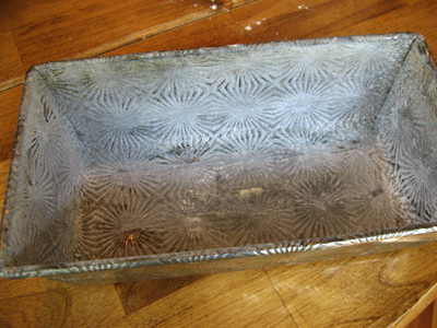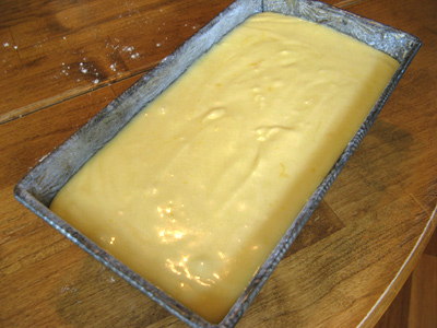 Prep a 9 inch loaf pan by greasing it first with butter, then dust with cake flour.
