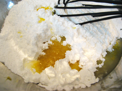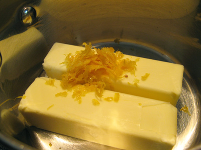 Melt 2 sticks of unsalted butter plus 2 tablespoons lemon zest in a saucepan over low heat. Continue stirring until butter is completely melted, set aside.