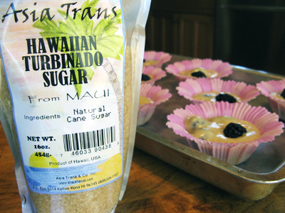 I brought back some raw cane sugar from Hawaii and sprinkled some over the batter before going into the oven. This is just like “Sugar in the Raw” if you want to add some sweetness to the top of your muffin. I baked these for 25 minutes at 350 degrees. If you have a smaller baking cup you may want to bake less time.