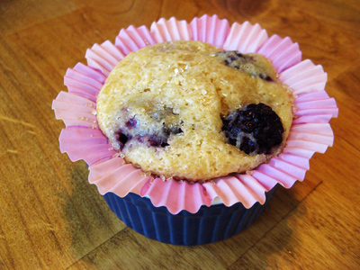 Every time I go through the “Wilton” isle at the craft store I see all these pretty baking cups for muffins or cupcakes. There are so many choices of shapes and colors and I want one of each. I went to the grocery store in search of an idea for muffins and found the blackberries on sale so I picked up a couple cartons and headed to the craft store to find the perfect muffin cups. I thought these bright pinkish cups looked like an open flower and thought they would be perfect for my muffins. When I started filling them with batter I found out they were too large to fit into my muffin pan. So, I placed some in ramekin cups and the others on a cookie sheet. The baking cups were stiff enough to hold up without a mold, however they did spread out a bit more than the ones baked in the ramekins. I had hoped they would look like a flower in bloom but I what I had in my head and what actually baked up were two different things. In the end I couldn’t be happier with how they tasted, they were so moist and berry delicious.