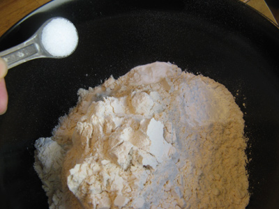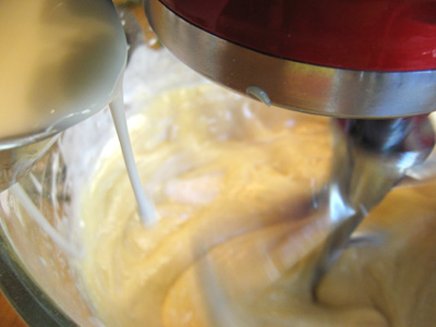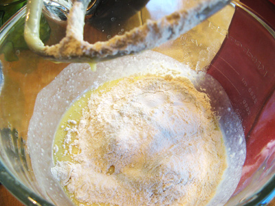 While this is beating I poured about half the buttermilk. When the mixture is blended, scrape the sides of the bowl and add the rest of the flour mix and buttermilk.